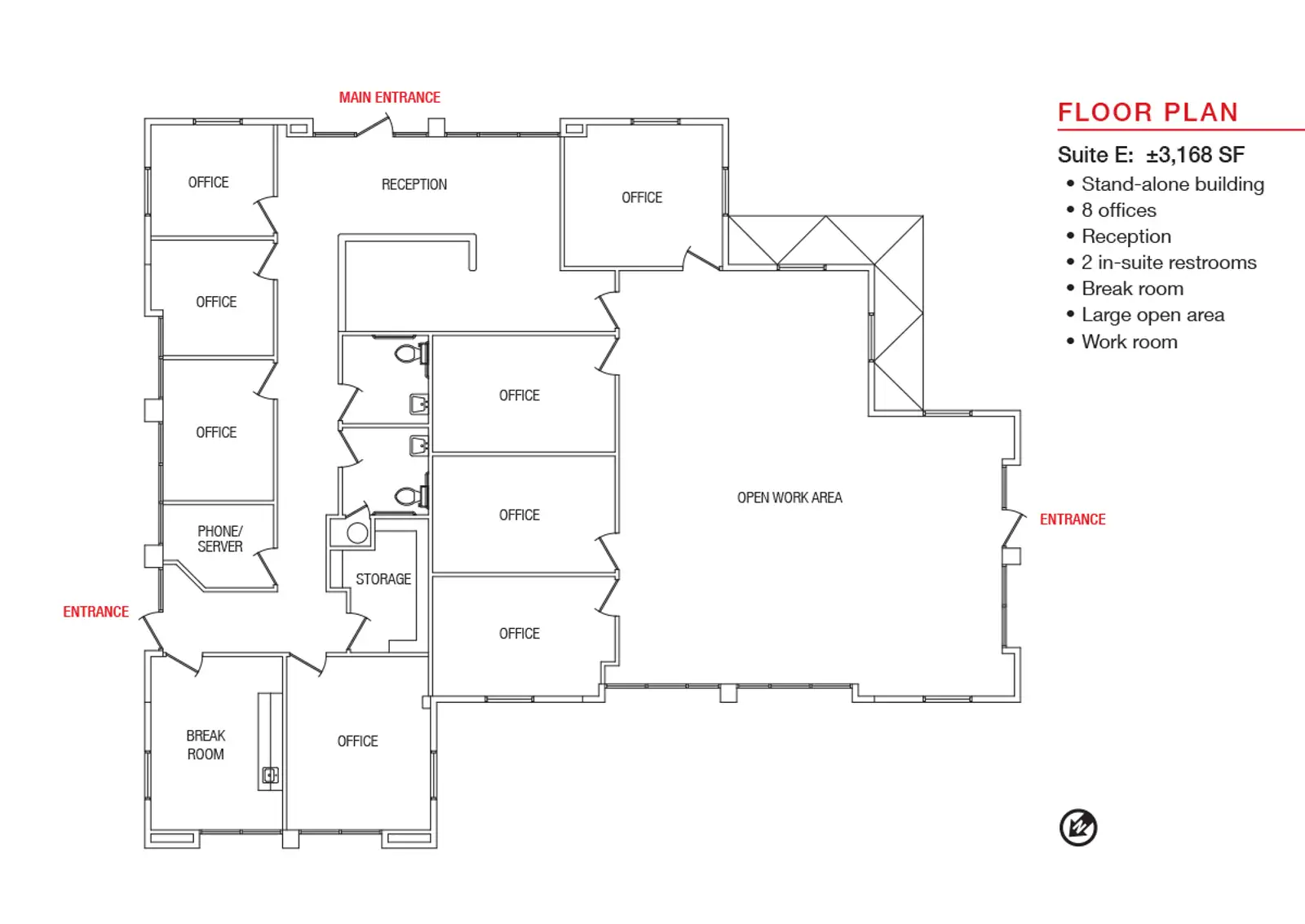 - 8 offices, reception, 2 in-suite restrooms, break room, and large open area